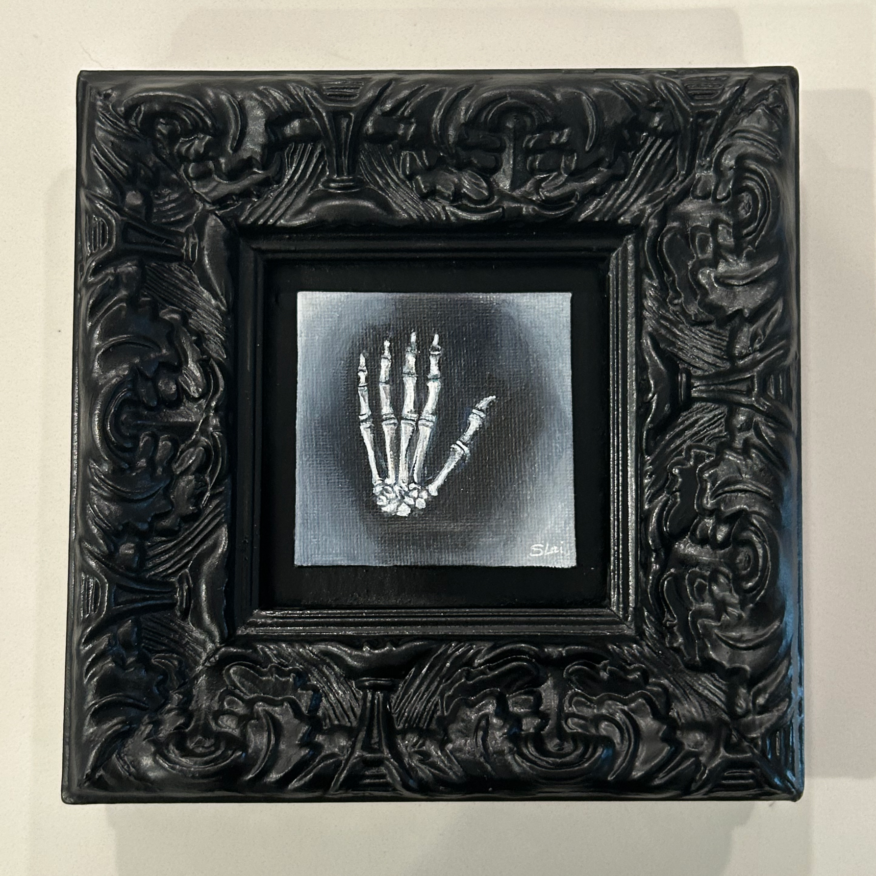 Skeletal Hand, 2023, acrylic and glow-in-the-dark paint on 3”x3” canvas mounted into a vintage frame.