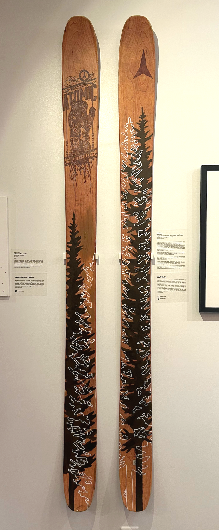 Tree Skis, 2025, acrylic on used Atomic Bentchetler skis - displayed here at Arts Whistler’s “Whistler Blackcomb: 60 Seasons Deep” art show at the Maury Young Arts Centre