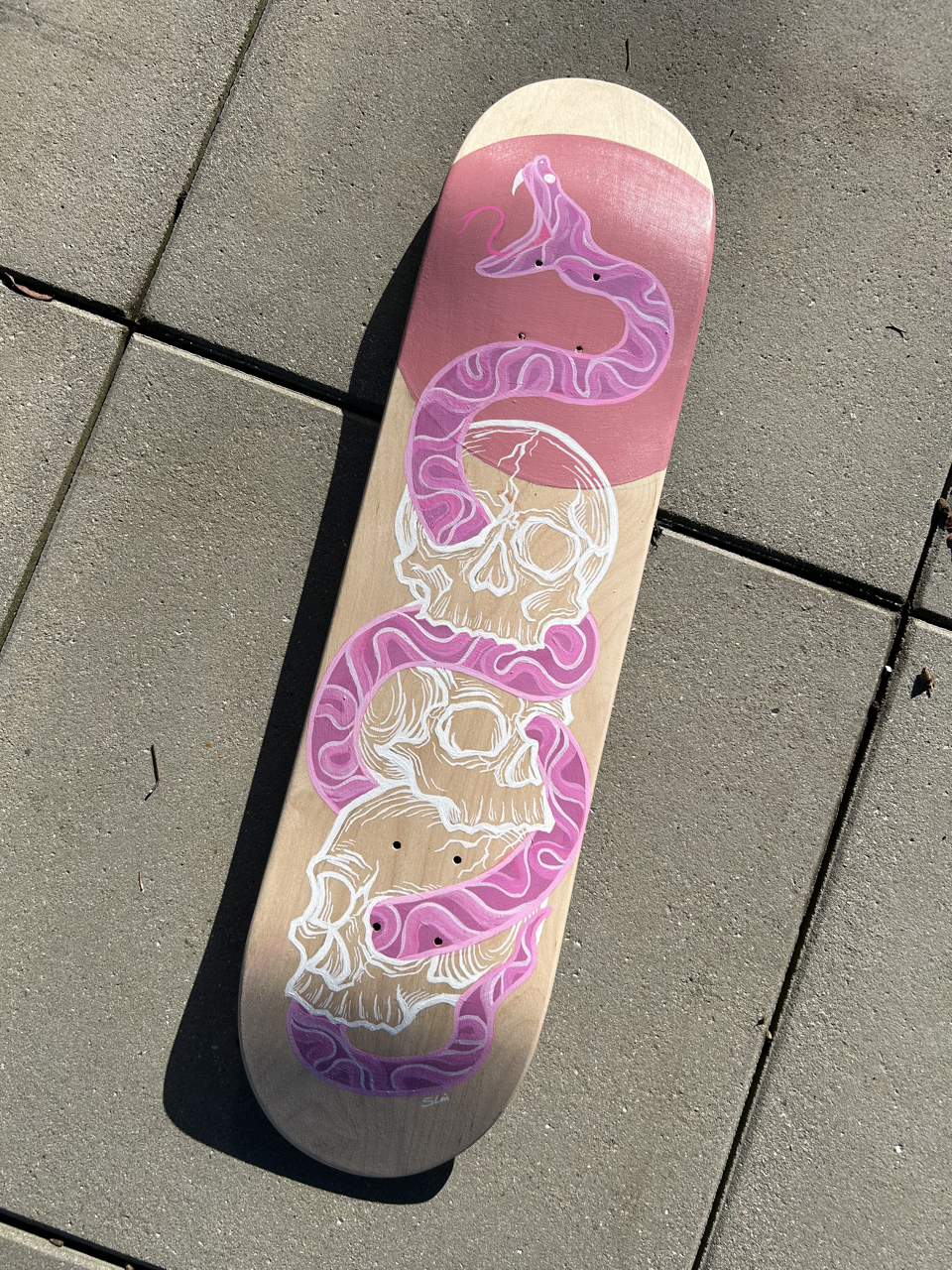 Pink Snake & Skulls, 2024, acrylic on skateboard deck
